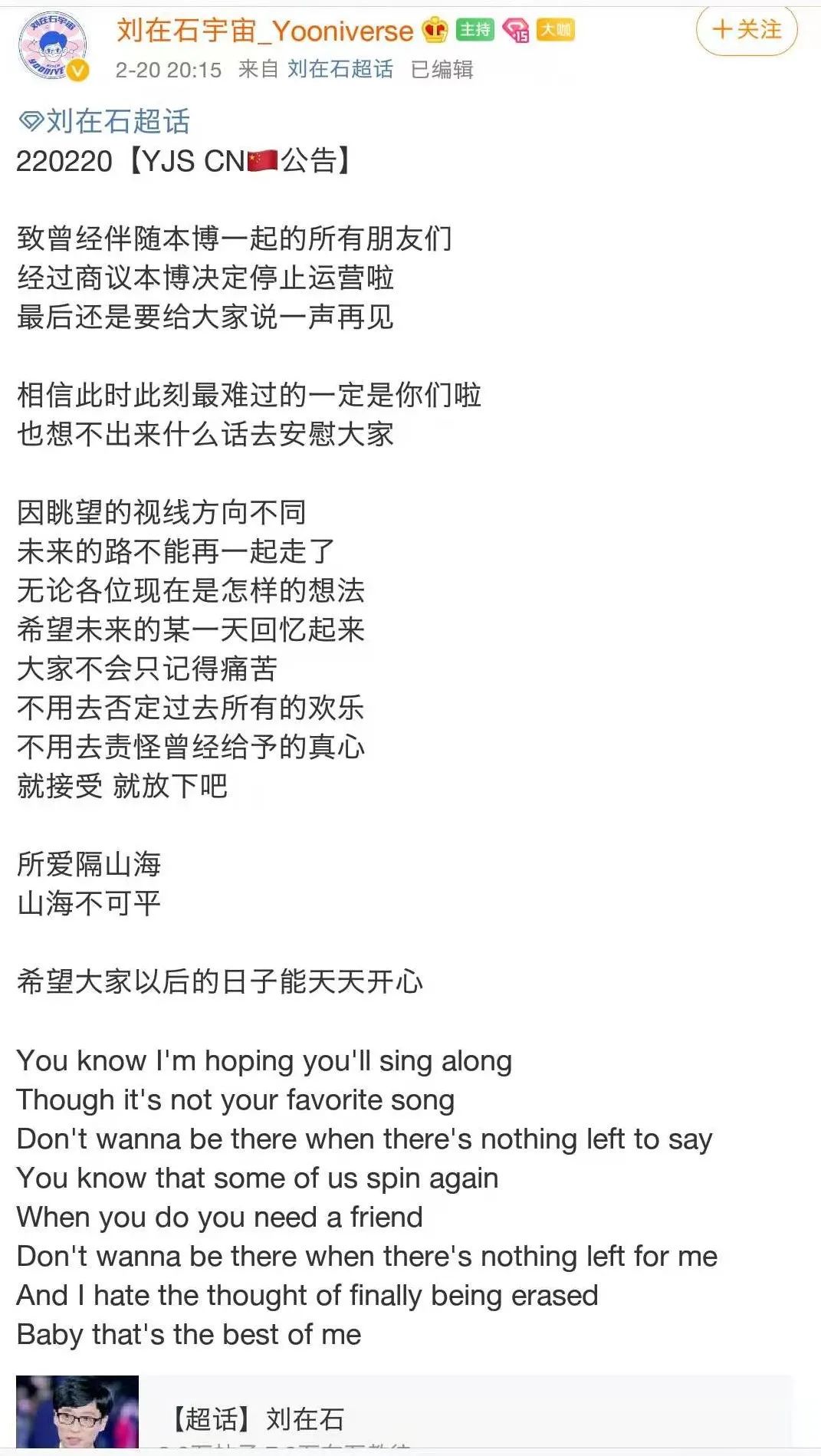 所以,刘在石在中国最大的粉丝站马上发表中英双文声明宣布闭站,粉丝站也表示: