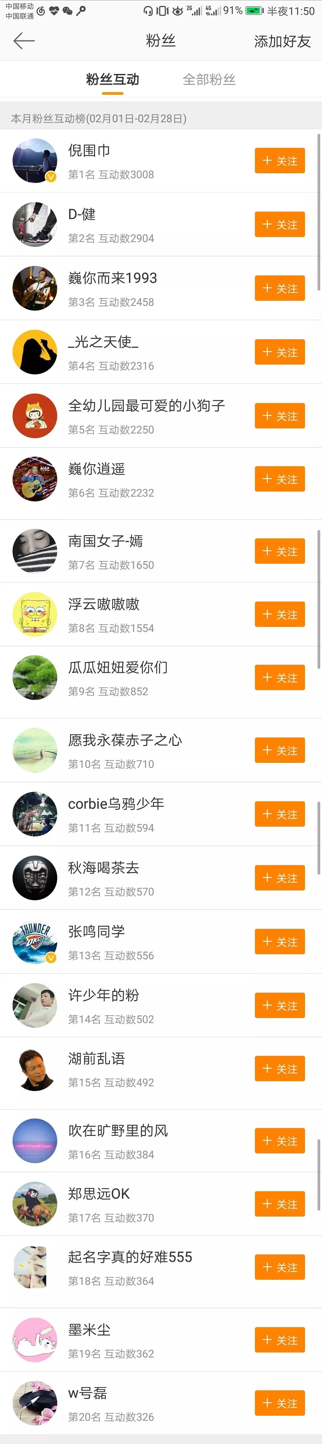 现公布2月1日到2月28日互动排行榜前20位巍迷榜单