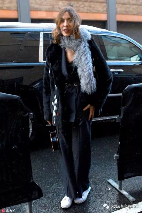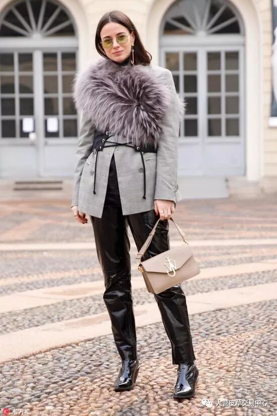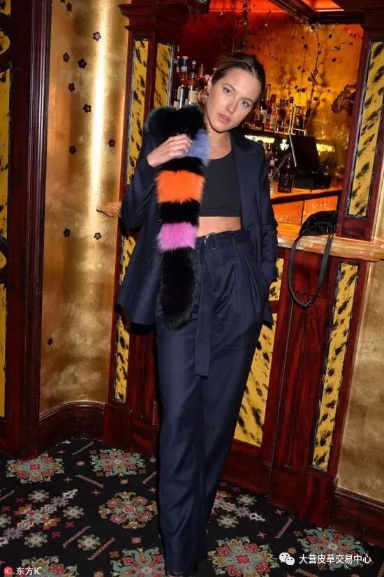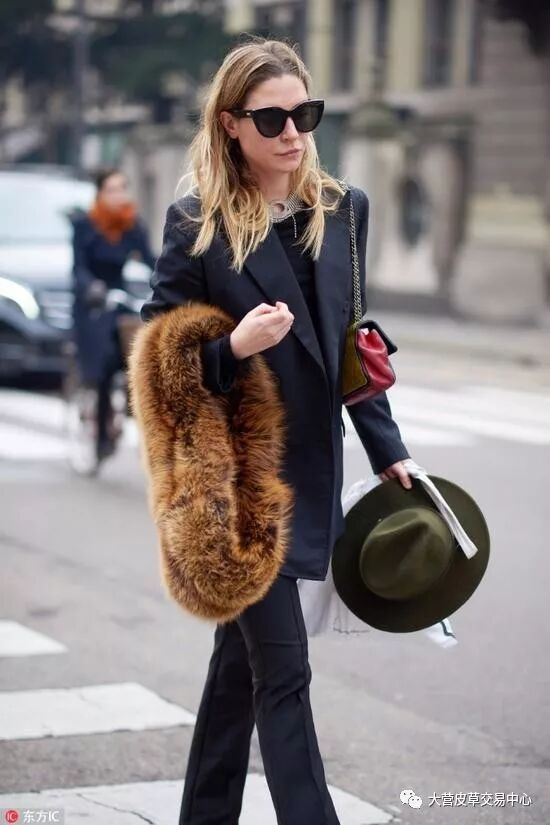 如同挎包一样把皮草配饰斜挎在身上,这样的穿法让皮草在造型中融入度更高。
