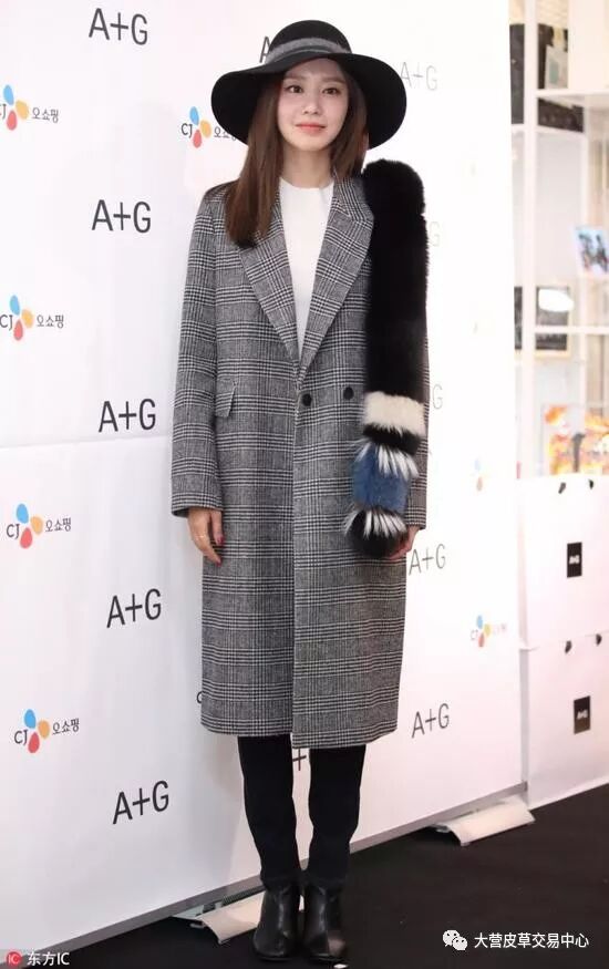 除了适合街潮感的造型,像金雅中这样穿着格纹大衣,一件富有色彩变化的皮草配饰不仅打破沉闷,也能稳住好气质。
