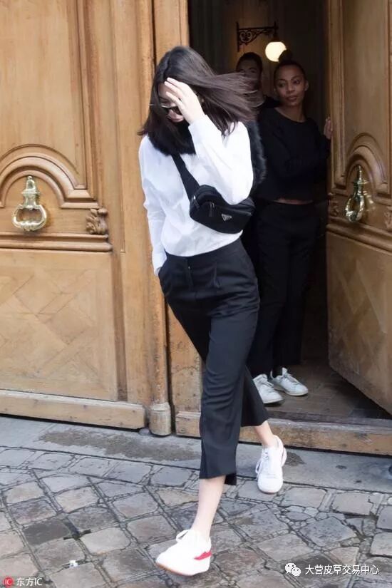 像黎女士一身运动装束,就要用皮草配饰提升一下整体的rich感,中和掉太过运动休闲的印象,实现混搭效果。