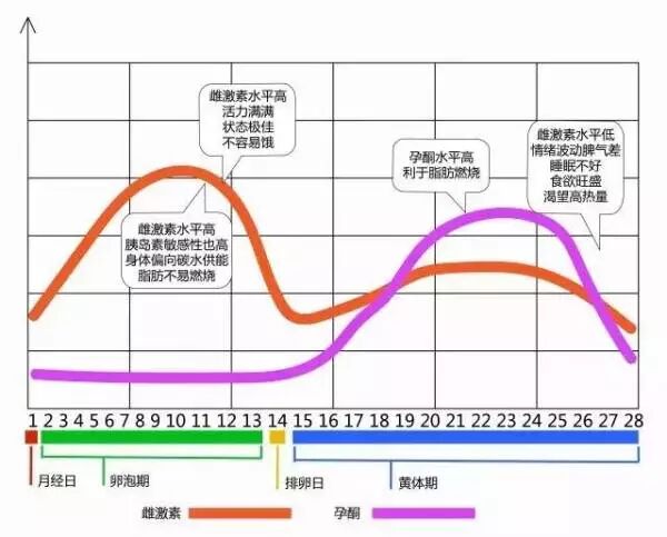 首先我们来了解一下,我们每个月迎来的姨妈分成的四个阶段,其中姨妈期的第一天开始,雌性激素的水平是最低的,到下一次排卵期的期间,代谢速率就会慢慢加快,达到巅峰之后又回到了平时的稳定水平。