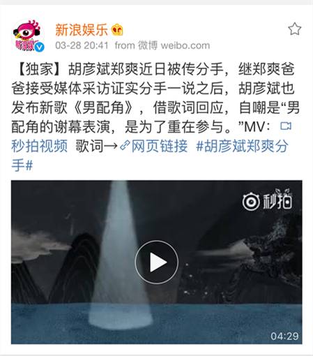 胡彦斌也在今晚发布新歌《男配角》,疑似对分手作出回应,歌词写道:“完美的谢幕表演,谁还在喊着你,男配角的谢幕表演,是为了重在参与,是本色还是扮演,是绝配还是配角。”
