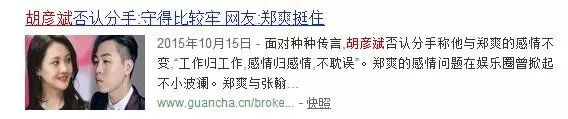 看来两人是真的分手了,不过郑爽的粉丝们好像很开心,当时爆出恋情的时候就有人预言“斌爽恋”不超过三个月,看来大家是真的不喜欢胡彦斌……