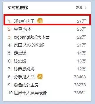 郑爽一人独占微博热搜榜的前两位,妥妥的微博热搜体质,据统计,郑爽这个月已经上了22次微博热搜榜了,没有任何一个一线明星可以达到郑爽这个程度关键是郑爽自己连微博都没有。22次,旁友们,连她吃个肉也是要上热搜的……