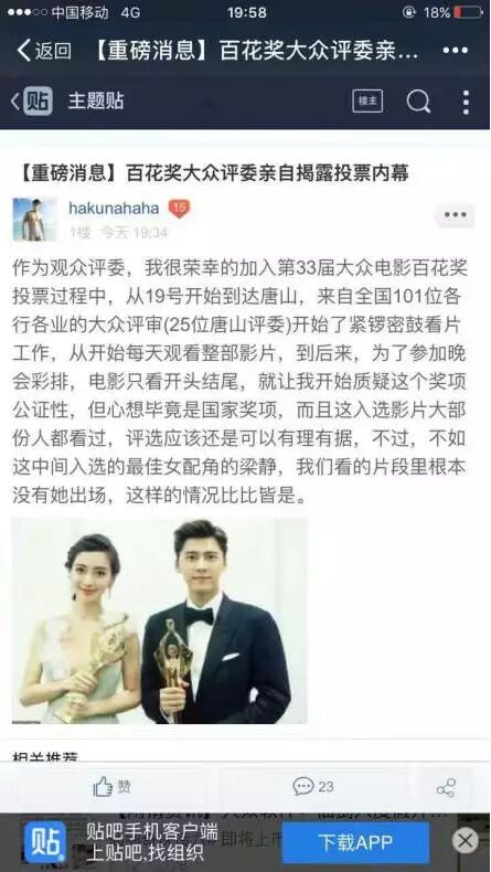 第33届大众电影百花奖举行颁奖典礼,说实话,这个奖项近几年的热度一直不高,但是,在两个奖项开奖后,瞬间上头条,李易峰获最佳男配角、Angelababy获最佳女配角。