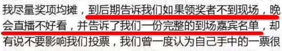 而在豆瓣另一张帖子,也有另一位自称是评委的观众,爆料如果领奖者不到现场,晚会直播不好看。