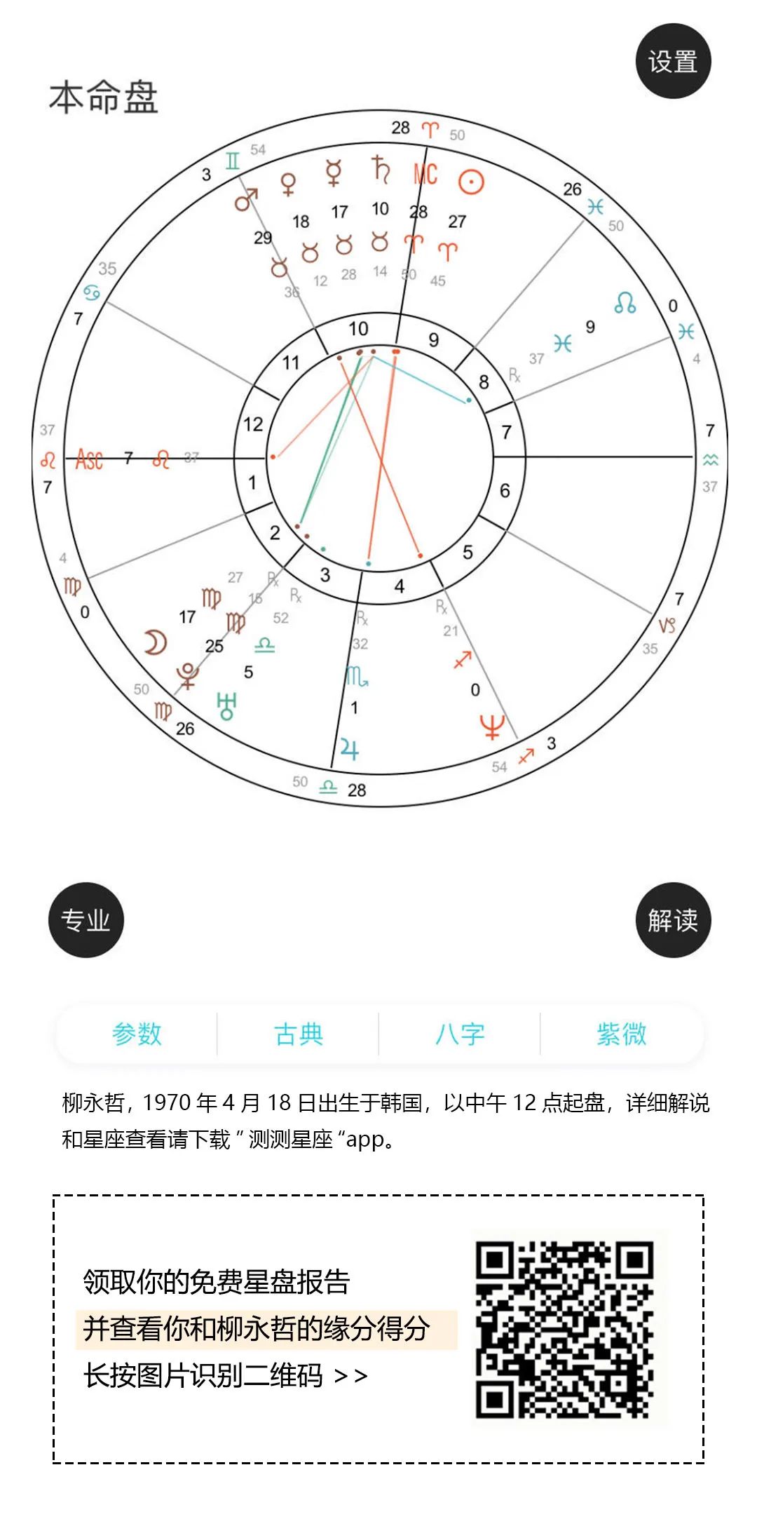 在柳永哲的星盘里,月亮与冥王有一个合相位,月亮代表个人的情绪和感觉,当月亮和冥王产生合相时,一方面他们有着更为强烈的感情——嫉妒、愤怒、对所爱之人深深眷恋,另一方面,这种感觉会被隐藏起来,变得隐秘而深邃。
