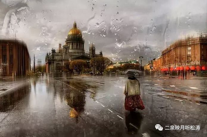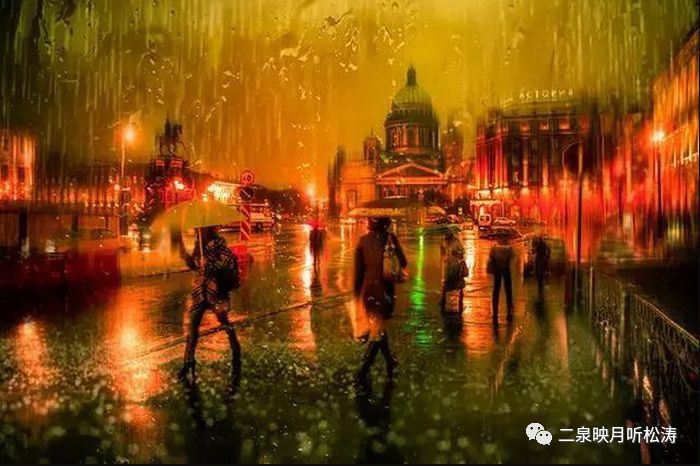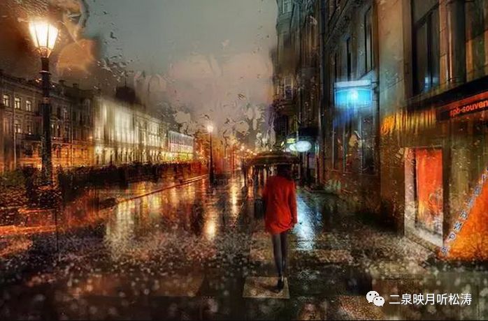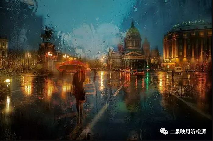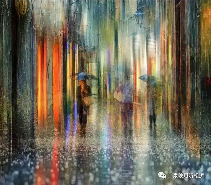 Eduard Gordeev并没有走在雨中拍摄,而是隔着玻璃拍摄户外的雨中画面。地上的积水映照着街头的光线,丰富了本来空荡荡的街道,雨水沿着玻璃流下,把街外的风景晕开成一抺抺迷幻的色彩,撑着雨伞的路人,就成为蒙眬一片里的点缀,无不为这雨中城市增添一份浪漫气氛。Eduard Gordeev巧妙的利用了空间距离产生的效果,配合一定的后期手段,使得作品如同油画一般。