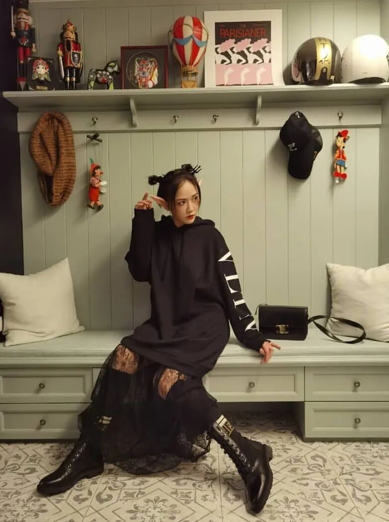 陈乔恩穿着黑色长款卫衣,搭配黑色高筒袜和鞋子,裙子的下摆是蕾丝,为其增添了几分性感。陈乔恩戴上自己新买的道具,画了个大浓妆,瞬间有内味儿了,邪恶又磨人的小精灵活灵活现。哪里能看出来陈乔恩已经41岁了,绝对的不老女神,少女味十足。