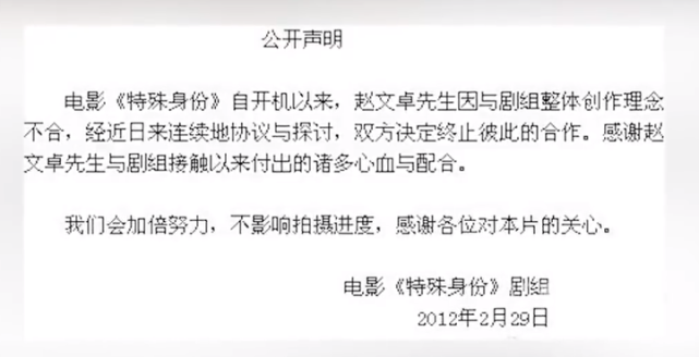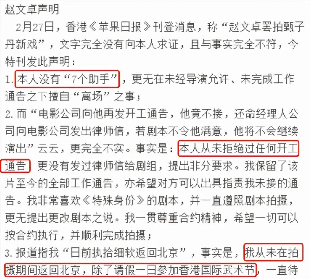 事件的起因,是由甄子丹、赵文卓共同主演的电影《特殊身份》突然发布的解约声明。