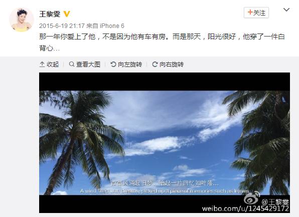 王黎雯在微博说:“那一年你爱上了他,不是因为他有车有房。而是那天,阳光很好,他穿了一件白背心...”