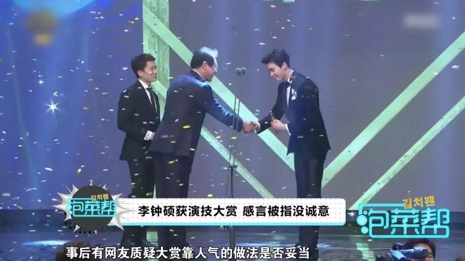 比起宋仲基的激动落泪,李钟硕的获奖反映则令人意外,作为首次100%由观众投票选出的MBC演技大赏得主,姜哲的感言未免太过言简意赅。事后有网友质疑大赏靠人气的做法是否妥当,指责李钟硕的感言敷衍毫无诚意。