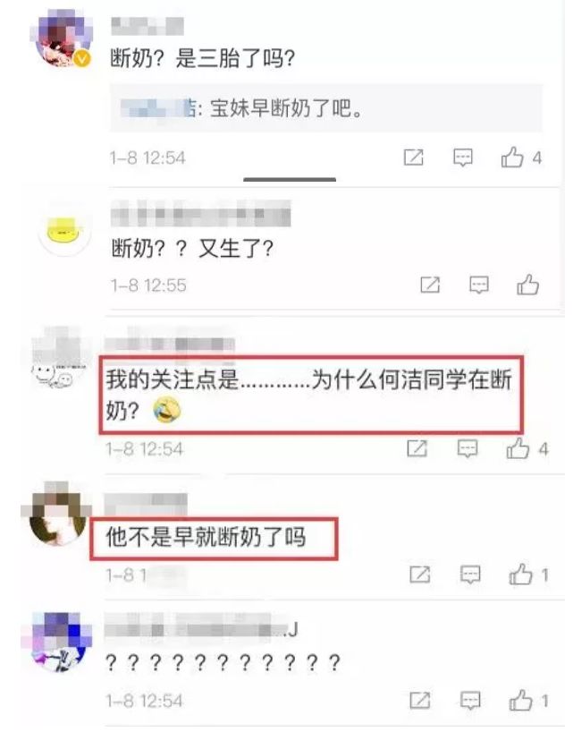 聊天记录晒出来之后,网友迅速捕捉到重点,纷纷打出许多问号,表示:为什么何洁同学在断奶?她不是早就断奶了吗?又生了?