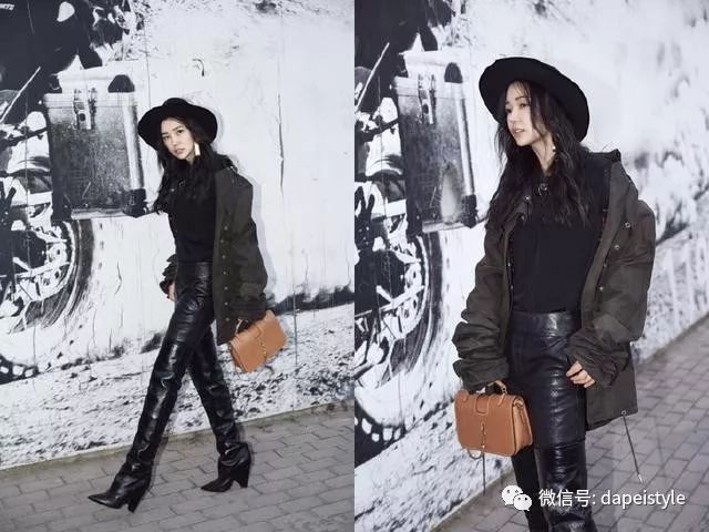 下一刻秒变酷girl的姚星彤,身穿廓形工装外套,下搭皮裤和过膝长皮靴,整体的穿搭统一又帅气。