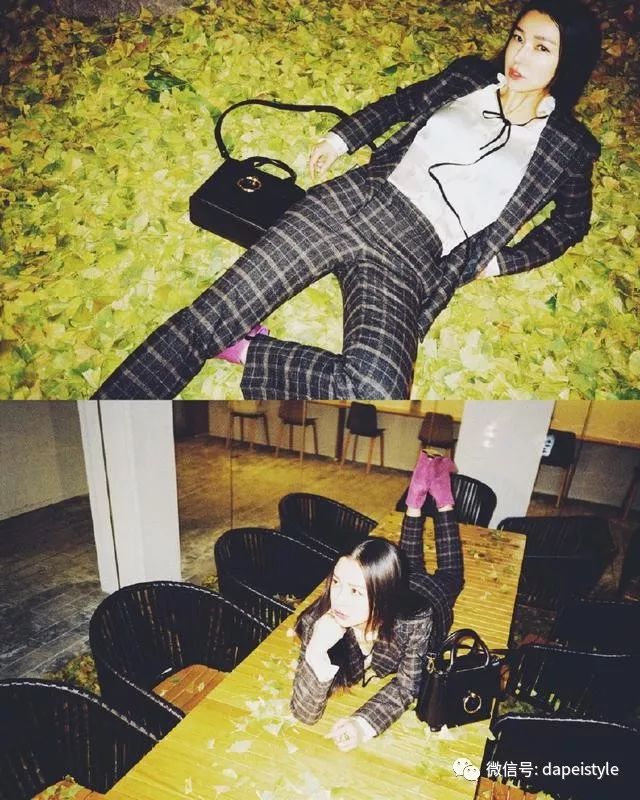 对于格纹西装的把握,姚星彤同样很出彩。白色修身衬衣外搭深色格纹西服套装的姚星彤,选择以一双紫色丝绒高跟鞋作为修饰,整体装扮提亮了不少。
