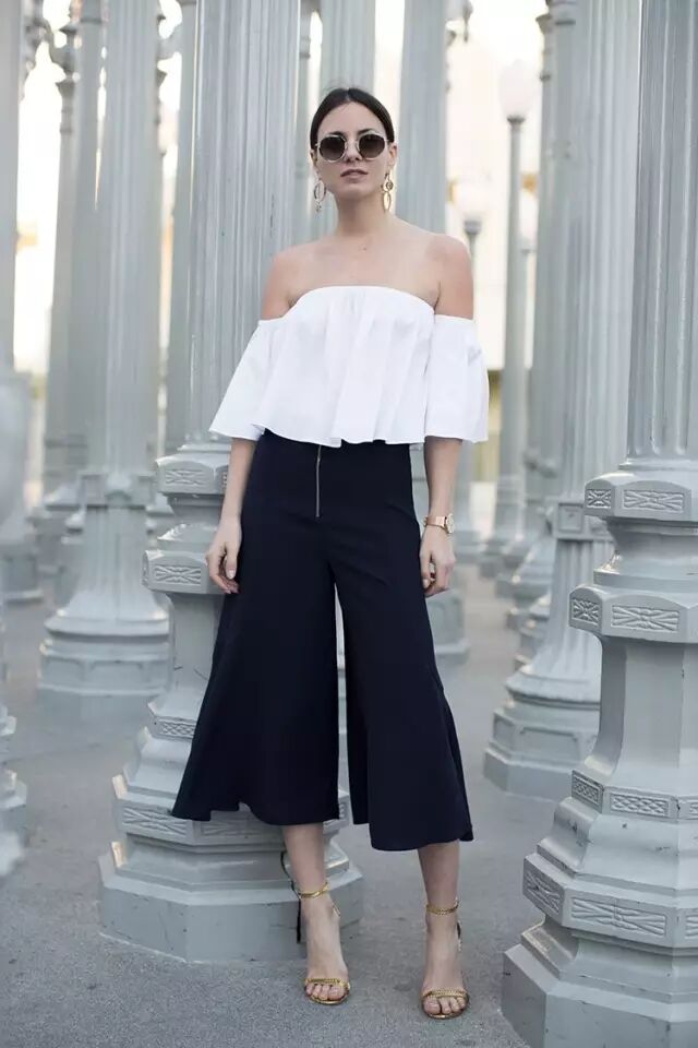 露肩装和短打上衣让梨形身材的妹子自然显露优点,并且让视觉重点聚焦。下装以宽松为主,选择直筒小脚裤、直筒短裤、阔腿裤都可以,裙装的话A字裙,直筒裙,伞裙都是好选择。
