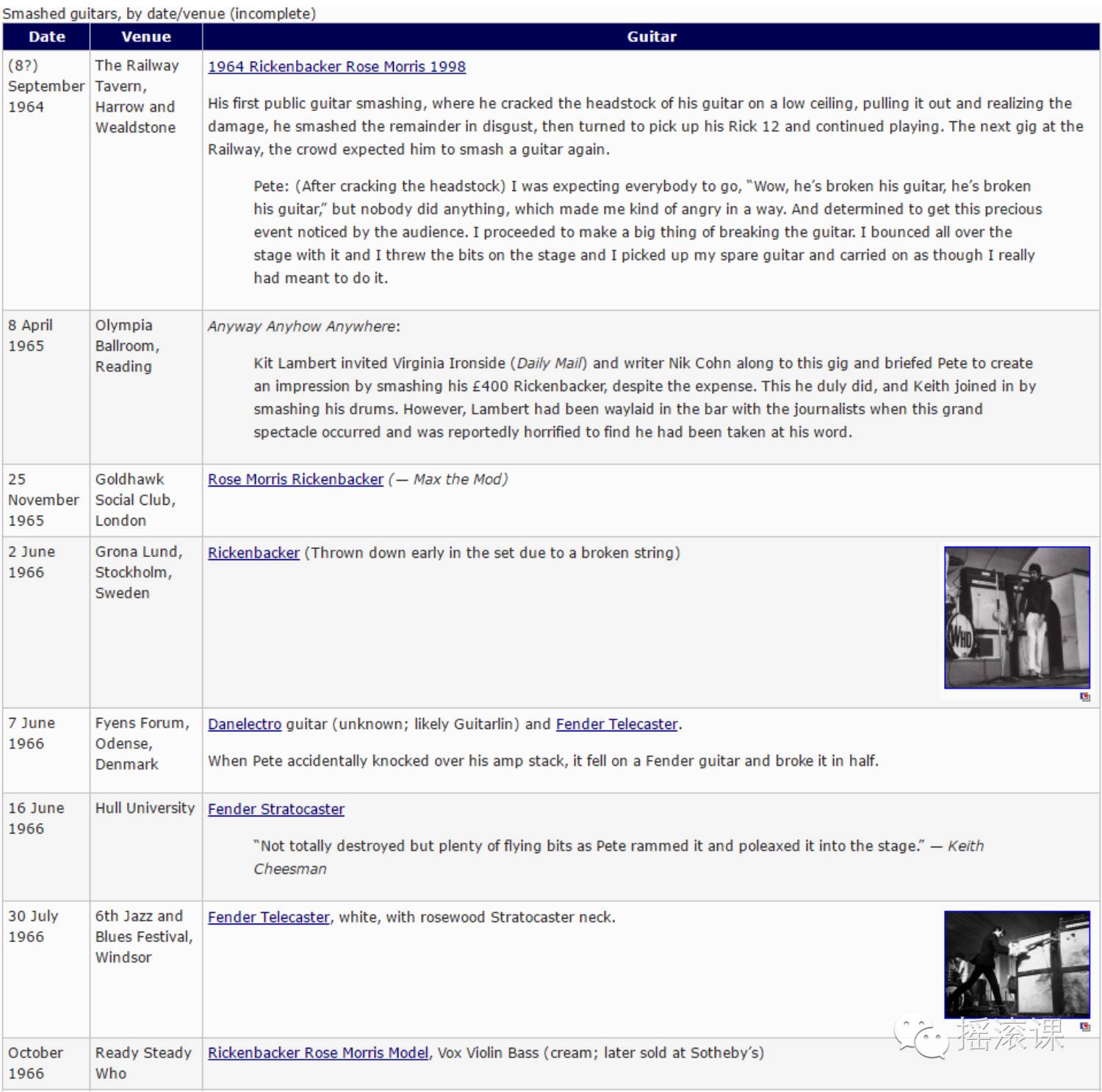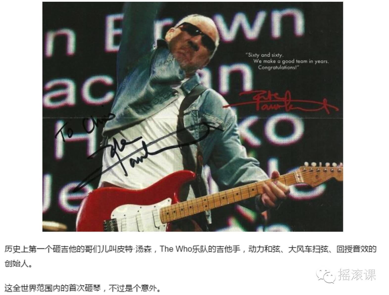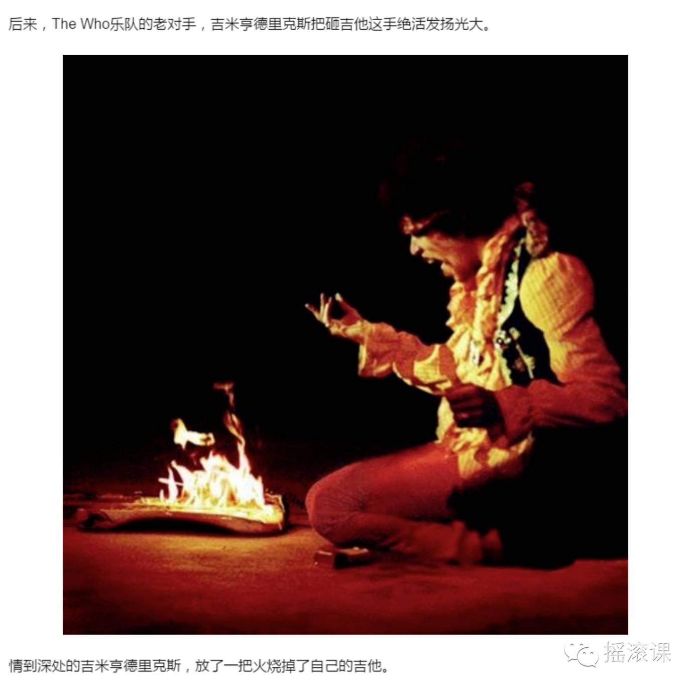 摇滚客曰:“历史上第一个砸吉他的哥们儿叫皮特·汤森,The Who乐队的吉他手,动力和弦、大风车扫弦、回授音效的创始人。”