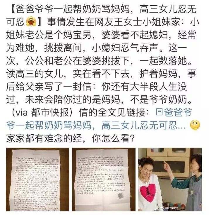 最后,读高三的女儿,实在看不下去,给父亲写了一封信:不要再帮着奶奶骂妈妈了!