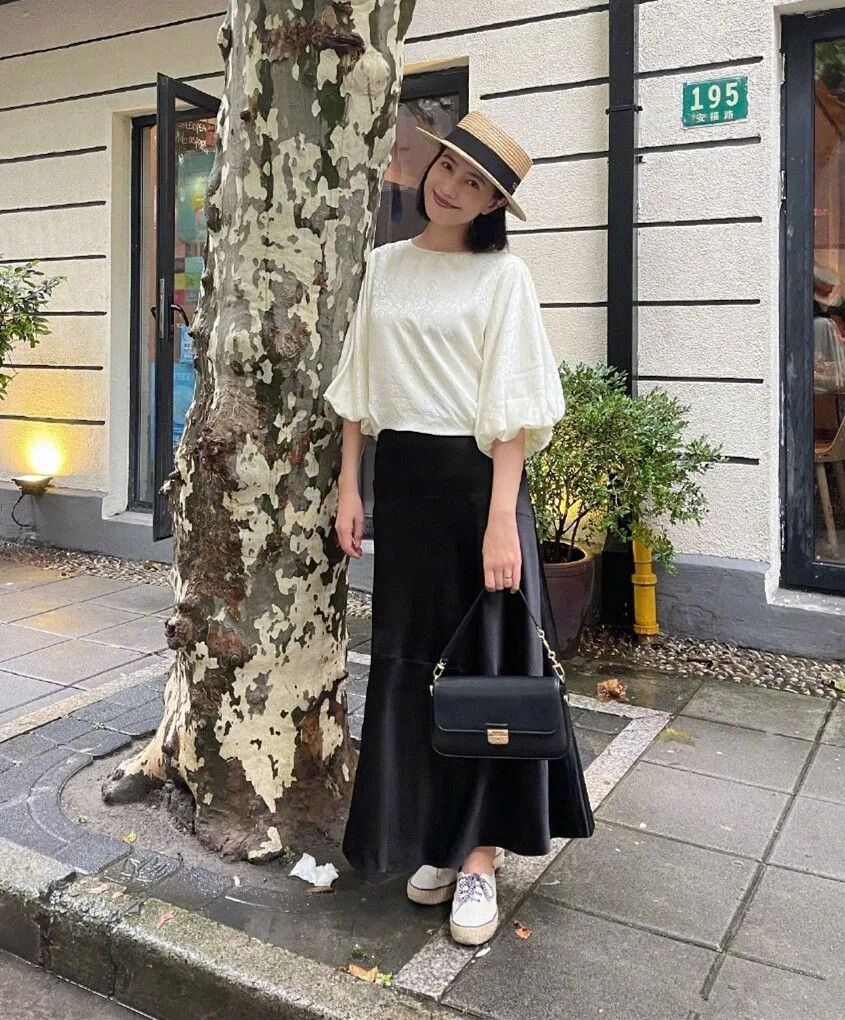 她的穿搭还是值得借鉴的,上半身穿的是那种白色的衣服,下半身就穿了一条黑色的裤子,整体看起来显得非常的优雅。她笑起来的时候确实挺漂亮的,因为本来长得就挺美的呀。