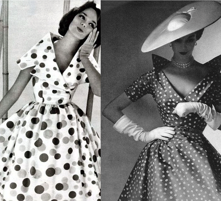 波尔卡圆点:同一大小、同一种颜色的圆点以一定的距离均匀地排列而成的图案。在上世纪50年代,以黑底白点作为配色的波尔卡图案是她们的首选,并且风靡了当时的电影电视圈。