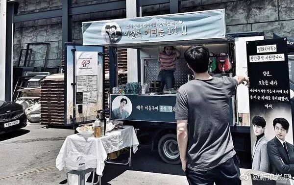 昨天,李栋旭向正在拍摄新片的孔刘送上咖啡车应援,招牌上还写着“真正因为友情而相爱的鬼怪,这次咖啡是1:1。”