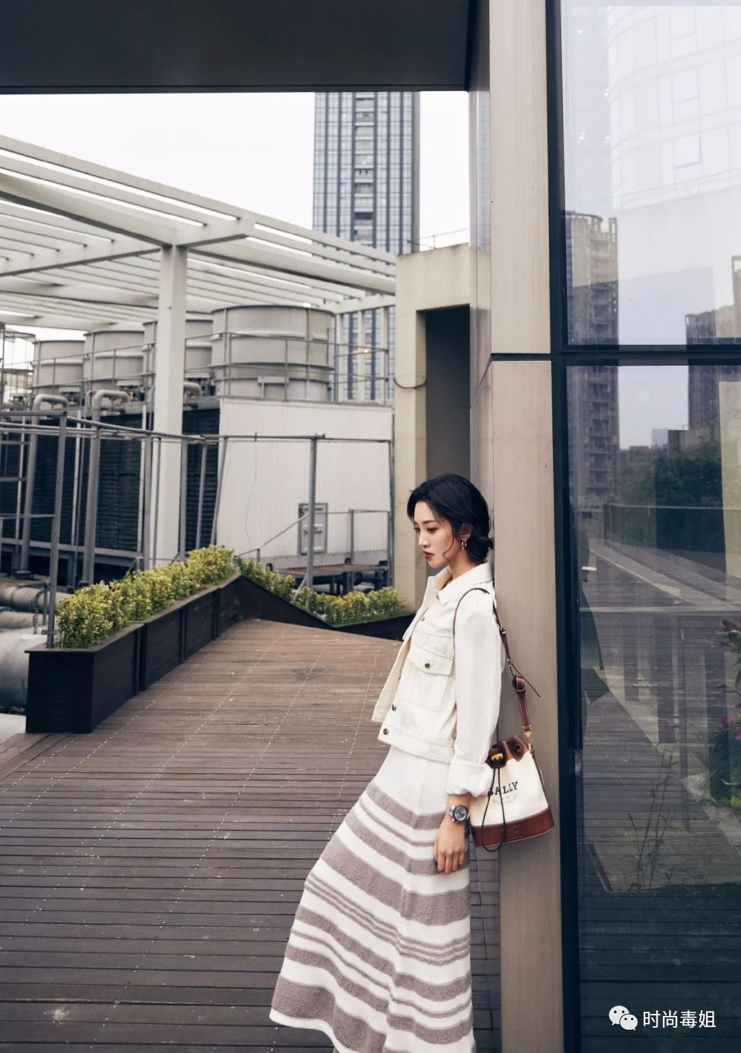 当然,搭配的效果并不是只看服饰的华丽程度,越是简约大方一些,也越能体现出个人身上的魅力。在这身造型中,唐艺昕就贯彻得非常完美,一条白色牛仔外套配上白色条纹长裙,造型简约,却不失优雅与知性,带有一丝轻熟女的穿搭魅力。
