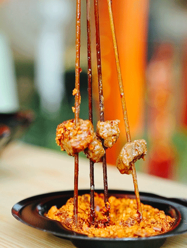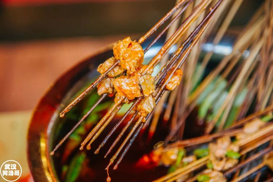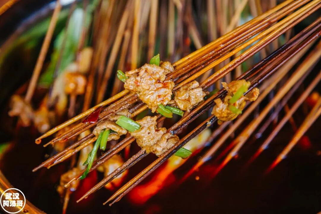 牛肉选用新鲜牛肉,当天屠宰场宰杀,通过秘制酱料腌制8个小时后串成串,是到成都串串店里必点的串串。
