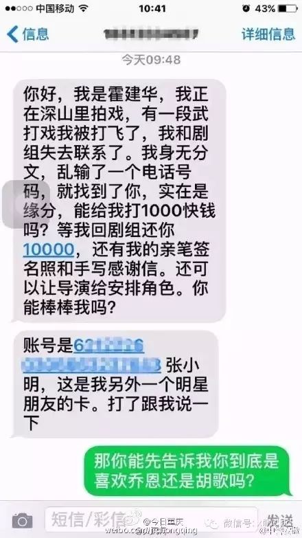 吴彦祖在深山被打飞居然向我借钱 幸福蓝海影城南京沿江店 港台男星 2016-03-16 09:01:30 351 创作不易,用心坚持,欢迎请BaGua喝几杯爱心咖啡!打赏并支持本文 打赏并删除本文 如果吴彦祖向你借钱千万别信如果是你,会怎样回继“吴彦祖深山拍打戏被打飞”后,“老干部”霍建华也中招了。是胡不是霍,,是霍躲不过……如果是你,会怎样回?哈哈哈哈哈哈哈哈哈哈哈我们上仙明明会飞,一定是遭暗算!!!据统计,一年在深山里被打飞的明星,加起来能绕地球一圈。而他们统统身无分文,只好胡乱输入一个号码,借款1000块,并豪气地表示会还10000,还附送签名照、手写感谢信。以及安排角色拍戏……我只有一个问题:深山老林里有ATM机吗?网友纷纷吐槽:大牌明星也有糊涂的时候内地知名女艺人汤唯在上海遭遇电信诈骗,被骗走21万余元人民币。汤唯事后已向松江警方报案,记者从警方获悉,警方已介入调查。记者了解到,目前汤唯正在松江车墩拍戏,今天下午,汤唯接到电话后,被骗约21万元人民币。发现被骗后,汤唯立刻通过电话报案。 2012年岁末,台湾地区爆发女星遭遇连环诈骗案,损失金额高达1700万新台币。在曝光的受骗的艺人中,蓝心湄可谓是最大牌的台湾艺人。据说,蓝心湄和其助理则因为想买mini cooper轿车却惨遭诈骗20多万人民币。蓝心湄在演艺圈中的资历都超过20年,除了演艺事业出色,而且经营的副业更是让她身家暴富。她投资的餐厅20年来在台湾开了8间分店,再加上投资房地产和古董、代理运动品牌,可谓是演艺圈身家超过2亿元人民币的“经营女神”。在《我是歌手》冠军即将揭晓的时候,制作单位举办粉丝票选,预测第一名选手。曾获得亚姐头衔的杨恭如就收到诈骗简讯,告知她获得16万人民币。但是,主办单位却紧急发声明强调:“这都是诈欺行为,请大家慎防被骗。”杨恭如便在微博晒出简讯内容,描述自己收到来自湖南卫视《我是歌手》主办单位的中奖通知,必须在时间内尽快上网输入认证码,才能领取“16万元的梦想基金与MacBook Pro笔记型电脑一台。”最后还郑重强调:“若将各人领奖信息泄漏给他人,造成冒名领取,本台一概不负责。”消息传出后,主办单位转发该讯息澄清:“这类信息都是欺骗行为,请大家注意慎防被骗。”追星有风险,转账请谨慎。霍建华连粉丝的一针一线都不愿意收,怎么会跟你要一千块呢?如果再有明星跟你说他在深山拍戏被打飞了……记得,“打死他”。扫描关注影城公众号微信公众号:xflhdcd QQ影迷群:206677024商务合作热线:025-57066522团购包场热线:025-57066522影城地址:南京市大厂区长冲街88号苏宁电器4楼 创作不易,用心坚持,欢迎请BaGua喝几杯爱心咖啡!打赏并支持本文 打赏并删除本文 感谢您的支持鼓励,我会继续努力的!文章地址:用户邮箱:打赏金额:USDT 请输入数字点击”去打赏“,即可进行打赏支持本文章哦 About the Author 幸福蓝海影城南京沿江店 功能介绍:影讯发布、活动宣传、优惠购票 官方认证:江苏幸福蓝海影院发展有限责任公司南京沿江分公司 Related Posts 【一贱你就笑】好声音张磊献唱主题曲 ,7月8日让你笑不... 2016-07-05 09:39:47 娱乐圈最有前途小鲜肉杨洋垫底,吴亦凡第三! 2016-05-16 10:24:03 撞脸李沁却更像刘晓庆,90后初出茅庐前途无量! 2016-05-05 13:57:23 吴彦祖在深山被打飞居然向我借钱 2016-03-16 09:01:30 跻身北京101位最有钱人,赵薇仅靠马云,黄有龙?这个女... 2016-03-03 08:53:58 发表评论