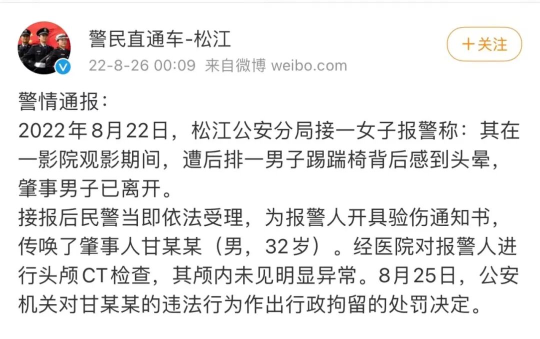 近日,上海一女子发文称在电影院看电影时,后排座椅孩童多次踢其椅子,制止无果后,孩童父亲用力踹其座椅靠背,致女子当场“眼冒金星”,回家后出现暂时性昏迷,经医院检查,可能有轻微脑震荡。警方通报:女子颅内未见明显异常,32岁肇事男子被行政拘留。
