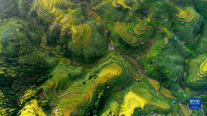 时下,贵州高原各地水稻长势喜人,陆续进入成熟期,金灿灿的层层稻田与民居、公路、河流、山峦等相映成景。