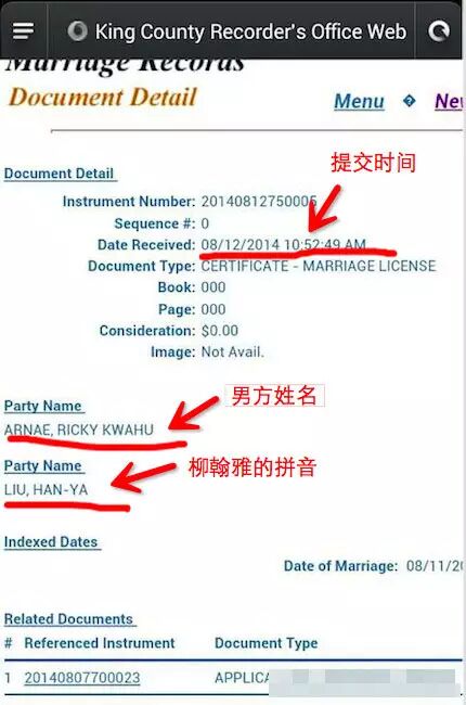 豆瓣某小组曝光了疑似阿雅(本名柳翰雅)在美国登记结婚的公开资料