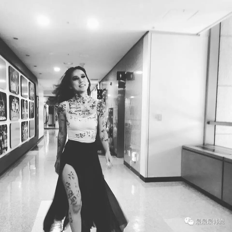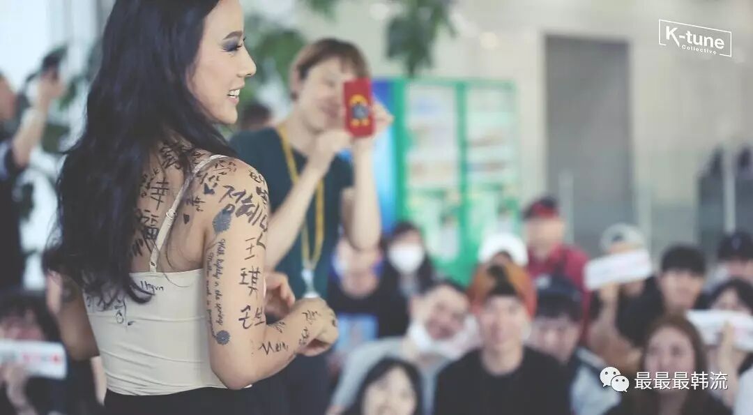 李孝利欧尼说要和粉丝们共同奋斗,所以她带着满身签名上台表演…这也是咱们昨天看到的现场画面。