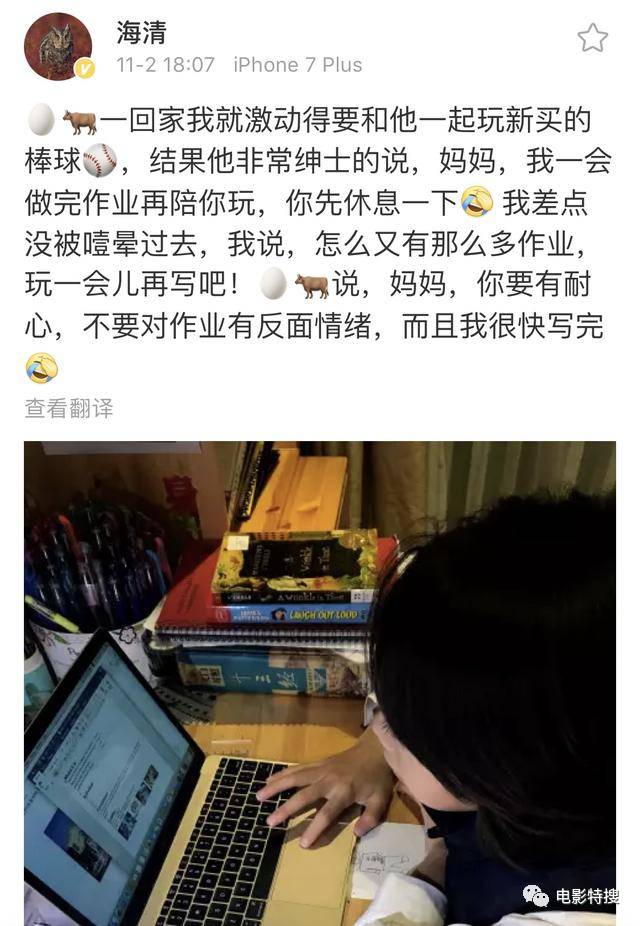 她在微博中配文:“一回家我就激动得要和他一起玩新买的棒球,结果他非常绅士的说,妈妈,我一会做完作业再陪你玩,你先休息一下,我差点没被噎晕过去,我说,怎么又有那么多作业,玩一会儿再写吧!他说,妈妈,你要有耐心,不要对作业有反面情绪,而且我很快写完”。海清儿子小小年纪,不抵触作业,反而把妈妈教训了一顿,学霸的世界不懂了吧。