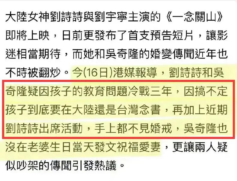 台媒称刘诗诗和吴奇隆已经冷战了3年,冷战的原因是因为孩子在哪里上学而产生了争执。
