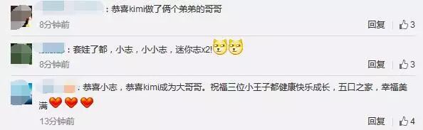 在得知林志颖双胞胎儿子诞生之后,网友纷纷为这个五口之家送上祝福,“恭喜Kimi哥哥”、“套娃了都,小志、小小志、mini志X2”、“人生大赢家”……虽然有了两个弟弟,网友们也不忘留言提醒林志颖:“家有三个儿子,别忘了Kimi哦~”