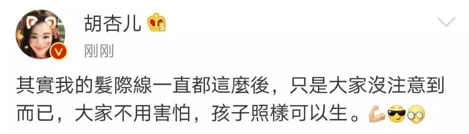 更好玩儿的是,后来胡杏儿还更博做出了回应和解释:其实我的发际线一直都这么后,只是大家没注意到而已,大家不用害怕,孩子照样可以生。