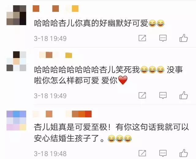 对此,粉丝们都忍不住被逗乐了,觉得杏儿真是太幽默太可爱了,还有小伙伴称:有你这句话我就可以安心结婚生孩子了。