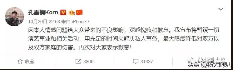 而到了晚上,孔垂楠本人也作出了回应,宣布将暂停演艺事业,专心处理这件事。