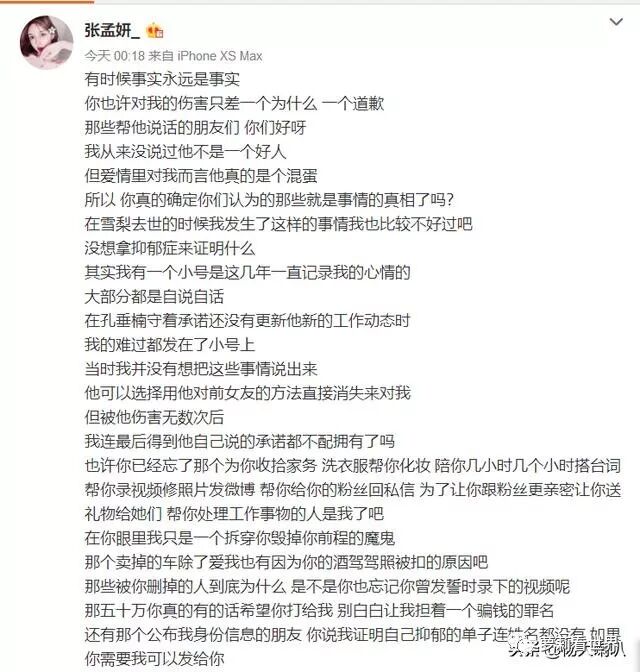 内容很长,其中有一些张孟妍自己的感慨,她表示不否认了孔垂楠是个好人,但在爱情里对她而言就是混蛋。随后张孟妍也对一些质疑做出了回应,包括卖车、50万、抑郁症等等。