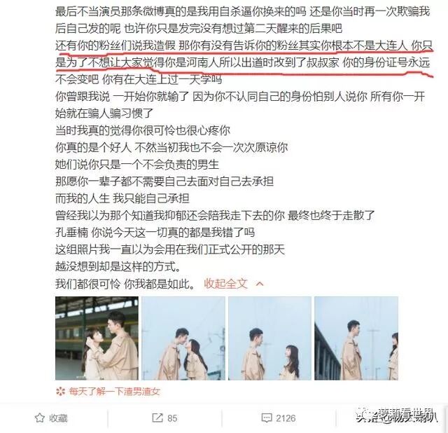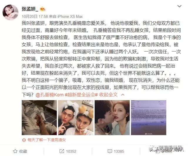 张孟妍爆料孔垂楠私生活混乱,两人到了快结婚的阶段,但屡次遭男友欺骗,还被他传染了不好治的病。一次次的欺骗让张孟妍抑郁症加重,自杀过几次,而后孔垂楠承诺陪女方一起治病,结果现在消失了。所谓女方才出来爆料想求一个公道。具体大家可以看上图,混乱程度有点让人瞠目结舌。