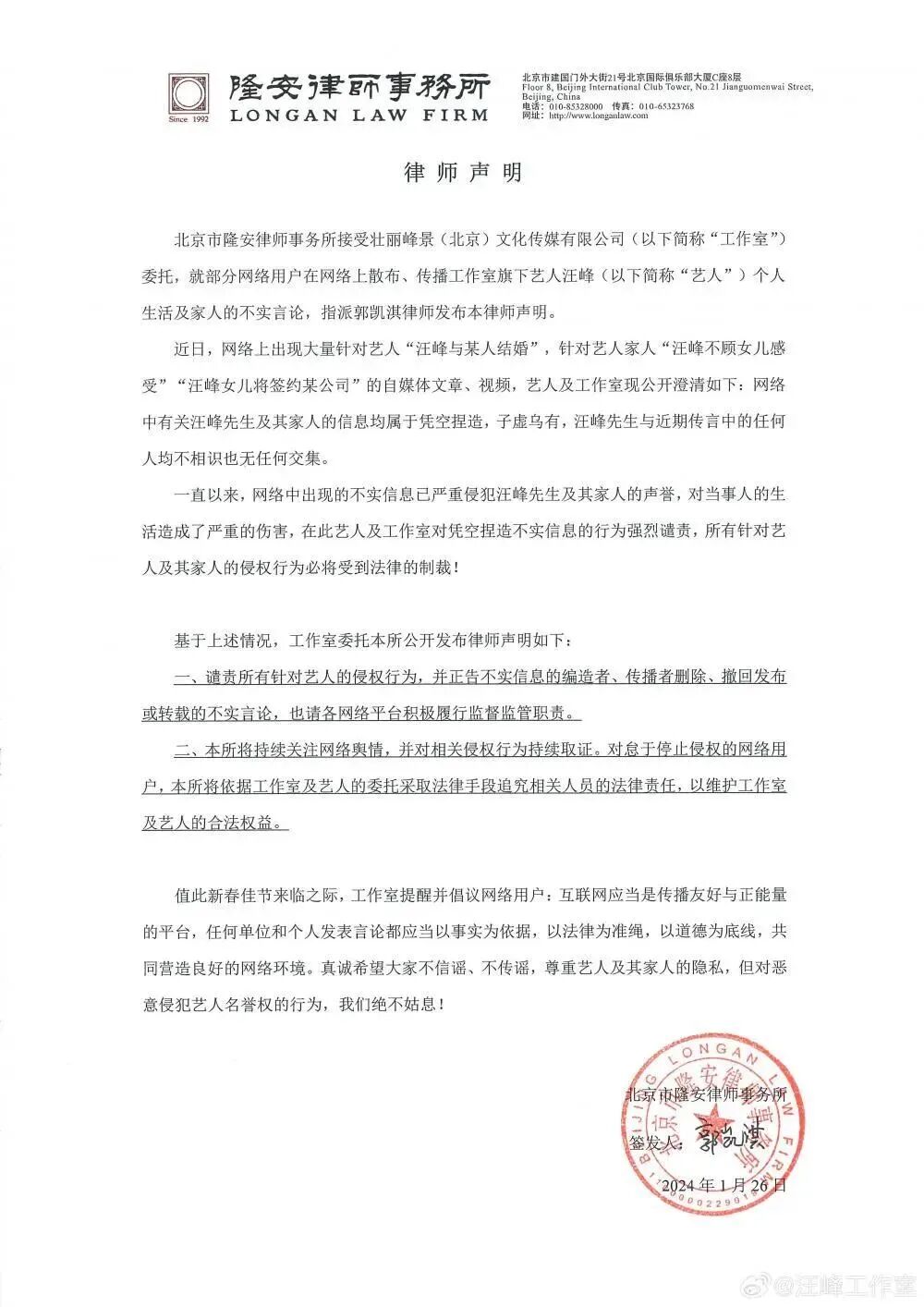 工作室表示相关不实信息已严重侵犯汪峰及其家人的声誉,将采取法律手段维权,并在声明的末尾呼吁网友不信谣、不传谣,共同营造良好的网络环境。