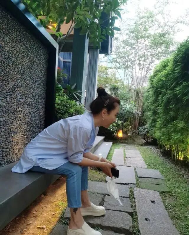 这张照片因为是在大晚上拍的,所以拍摄的效果并不是特别的清晰,但是可以明显感觉到李玲玉的身材真的保持的挺不错的,下面穿的同样是一条牛仔裤,只不过这条牛仔裤的长度才刚好到膝盖那里,所以下面的那双小腿就会显得更加的苗条。