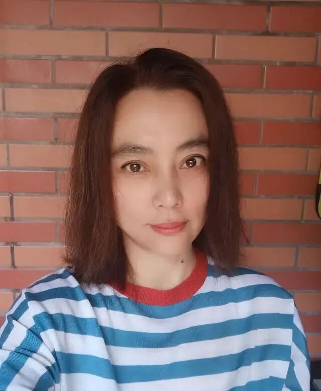 李玲玉因为头发稍微做了一定得打理,所以可以看到其实新长出来的一些头发会显得整个人的头发颜色发生分层的情况,当然这也是比较正常的,身上穿的是一件条纹的衣服,这件衣服的颜色本身是以白色和蓝色为主,但是在领子那里选择的又是一圈红色的线条。