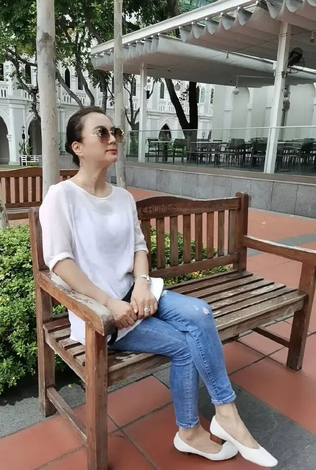 李玲玉现在皮肤保养的其实也是挺不错的,起码会让人觉得比较的细腻,而且脸上几乎是没有皱纹的出现。这个时候穿的又是一件白色的短袖,这件短袖的质地看起来也显得会比较的单薄,下面搭配的还是一条牛仔裤,并且选择的是紧身的版型。