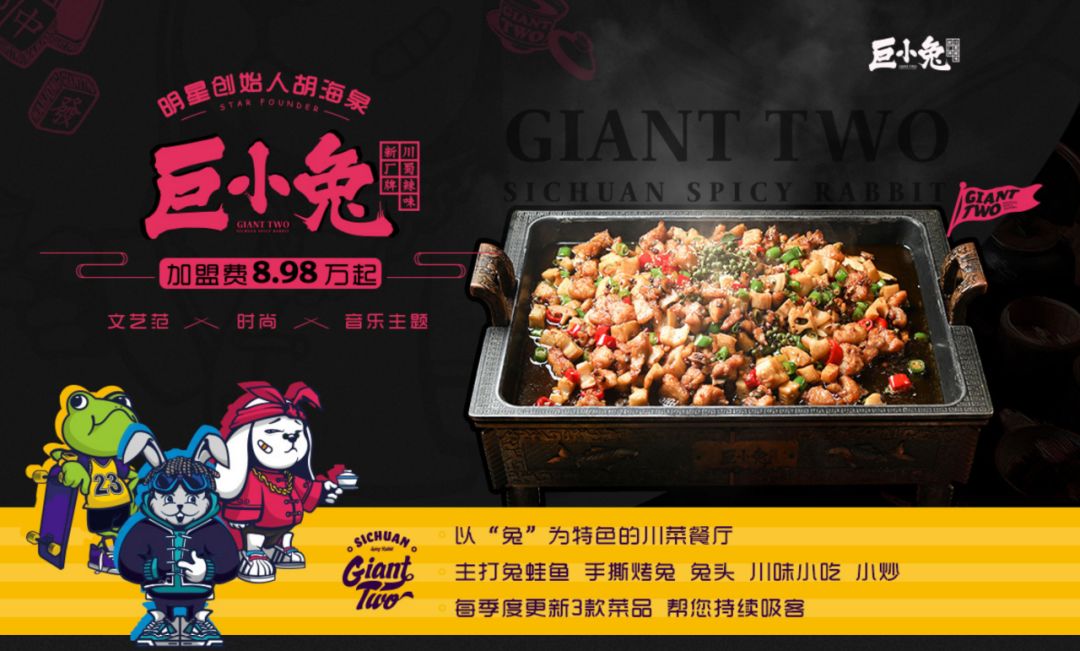 后来策划“巨小兔”,更是锁定在川菜中的“兔+蛙”两大爆品。凭借高效的盈利模式和胡海泉强大的明星效应,巨小兔实现了150㎡的店面不足一年回收成本的运营数据,为其全国连锁布局奠定了良好的基础。