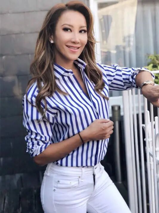 这样穿起来还是比较的显年轻条纹的衣服搭配一条白色的裤子。感觉脸上没有皱纹的话,会显得更年轻一些,而且看起来也更有气质了,一点都不显老呢。