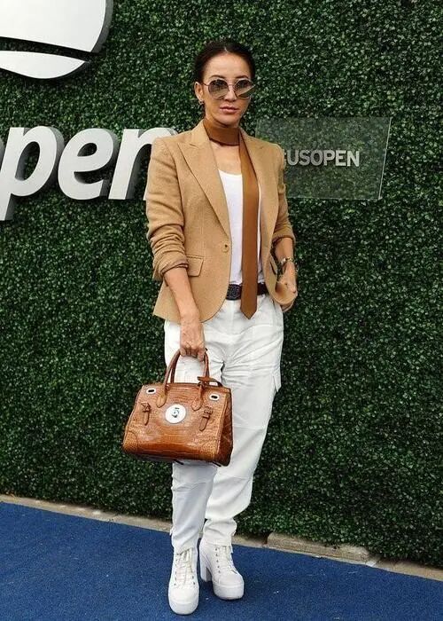 棕色的西装搭配白色的衣服也挺好看的,就显得特别的有个性。虽然她的皮肤看起来会有点黑,但是这样打扮的是真的很酷啊,因为不老怎么都好看。
