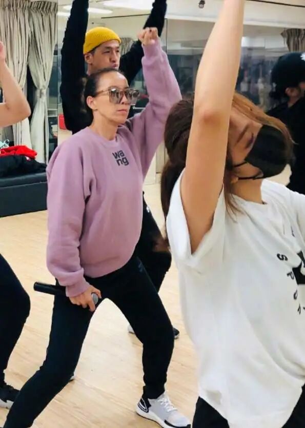 她穿着一件红色的西装,比较的有特色,里面搭配的是那种黑色的衣服。就是感觉脸上的皱纹藏不太住了,而且感觉发际线有点后移,是真的有点变老了。