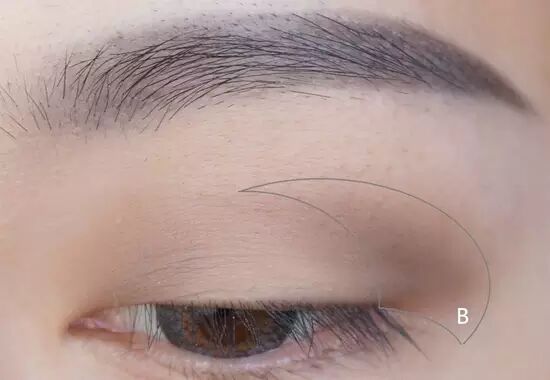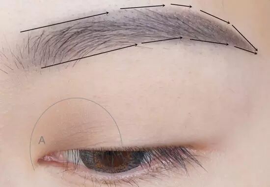 首先用黑灰色眉笔画出没有明显棱角的眉毛,弧度要圆润,标出的走向是弯弯的眉。在眉峰后要逐渐加重颜色,形成层次感。标出的A部分用浅色眉粉打个眼窝的底。
